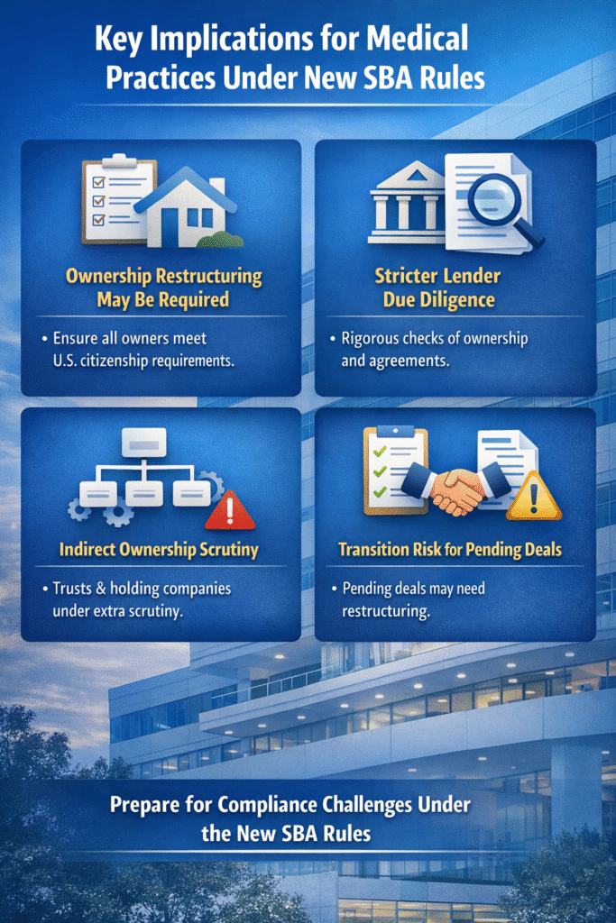 From March 1, 2026, the updated SBA guidelines now bring in stricter ownership requirements for businesses applying for SBA-backed loans. Under these rules, even a small percentage of ownership held by an ineligible partner can prevent a practice from qualifying for funding. Moreover, a lot of healthcare practices operate with multiple physicians, investors, or stakeholders, so these changes may create unexpected financing barriers.